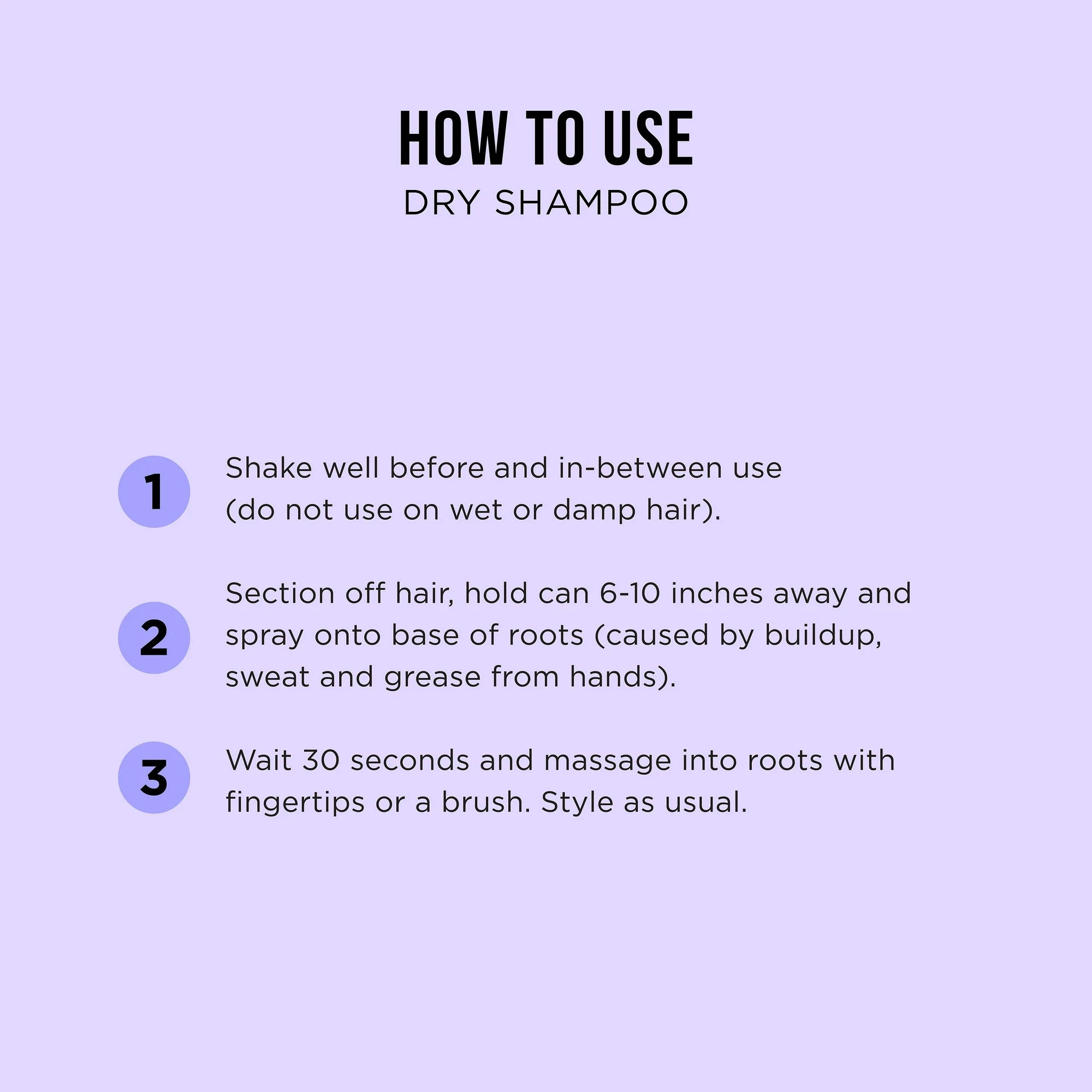 Shake well before and in-between use. Section off hair, hold can 6-10 inches away and spray onto roots. Wait 30 seconds and brush through or massage with fingertips. Style as desired.